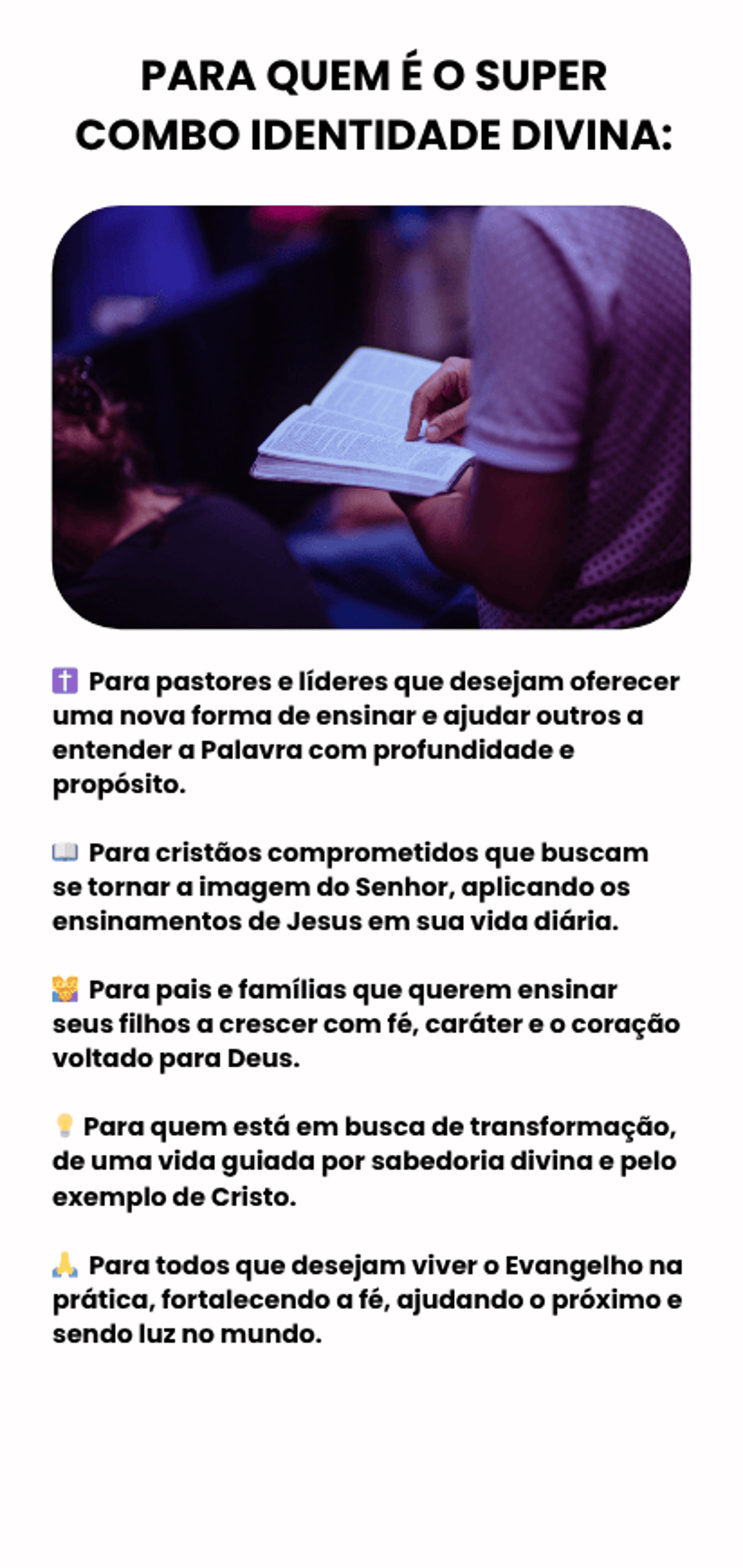 Com as atividades “Como Ser a Imagem do Senhor”, você aprende, na prática, a viver como Deus deseja — com atitudes, palavras e escolhas que refletem o caráter de Cristo. Cada dinâmica mostra como desenvolver virtudes como amor, paciência e fé, tornando-se um verdadeiro reflexo do Senhor em cada área da vida.
