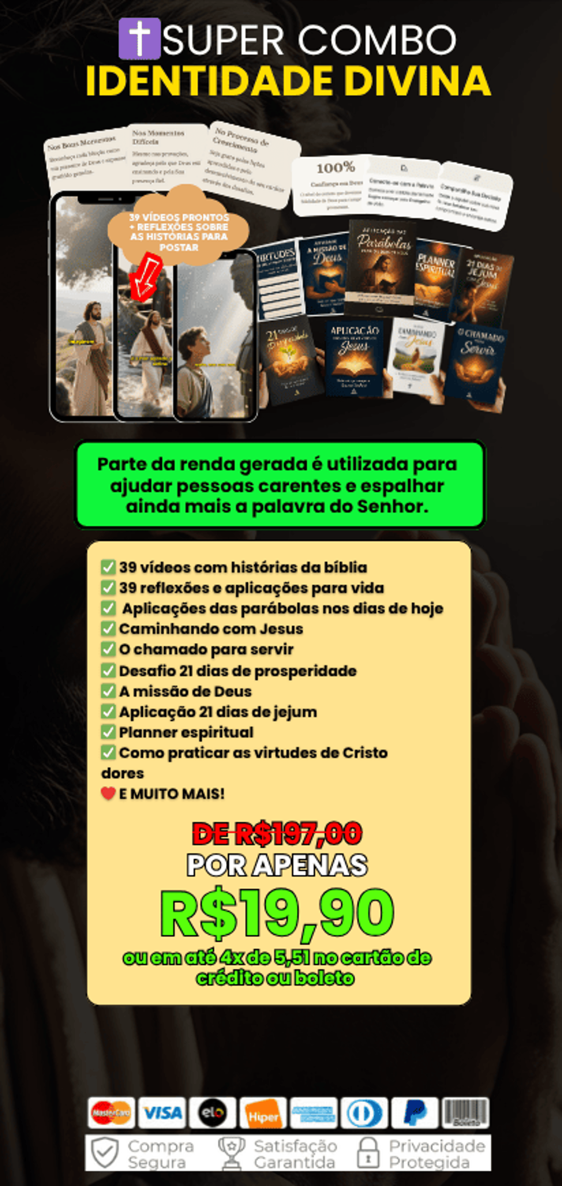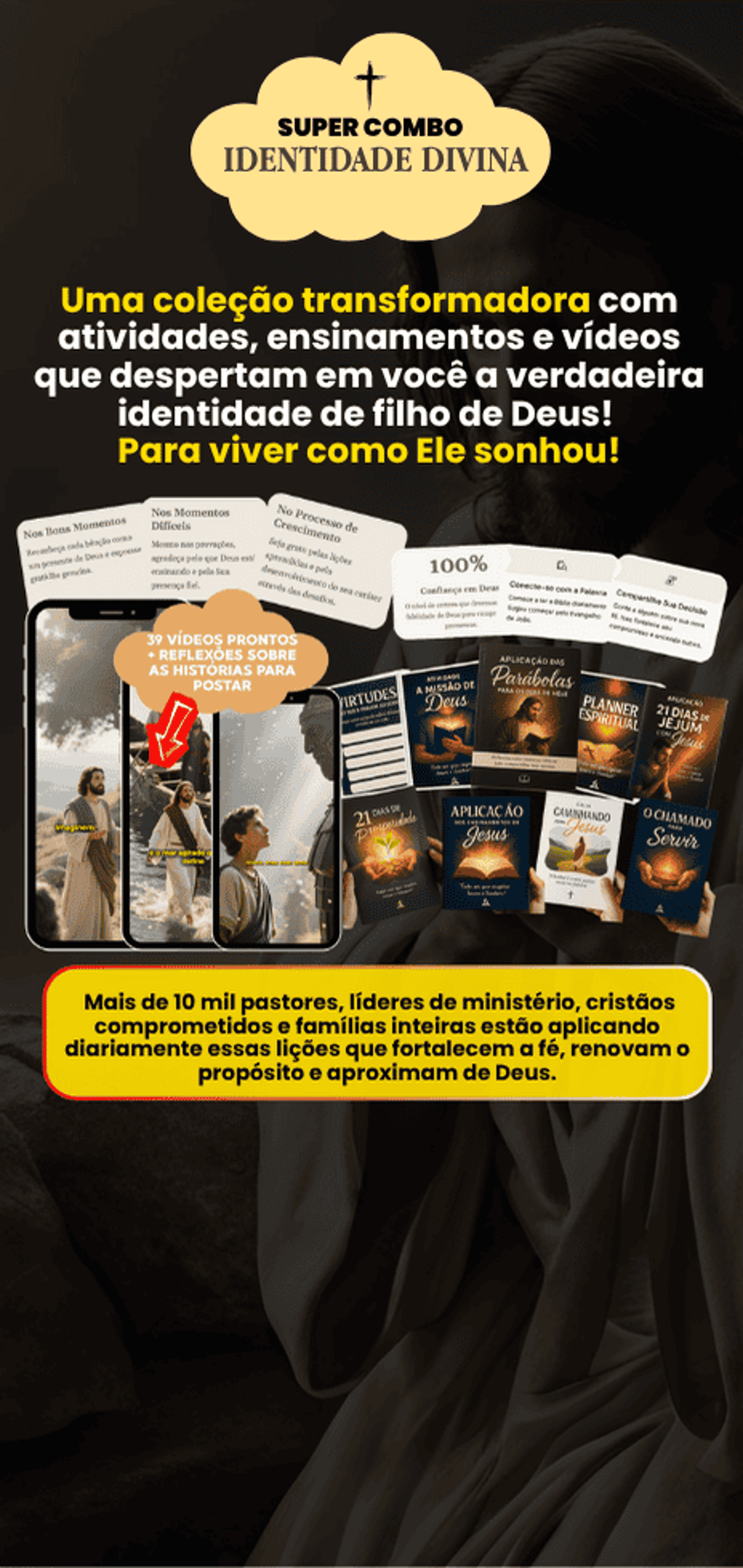 Pack com 39 Vídeos Cristãos, onde você pode postar nas redes sociais ou enviar mensagens tocantes e reflexões da Bíblia pelo WhatsApp, espalhando fé e inspiração. Cada vídeo contém sua reflexão e atividade que fortalece a vida espiritual, reacende o amor por Cristo e torna o evangelismo algo simples e poderoso de viver, todos os dias.